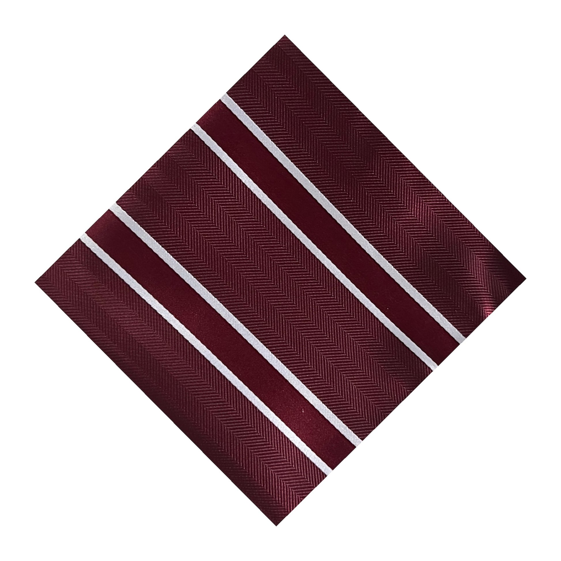 A rich burgundy herringbone pocket square with clean white double stripes, offering a sophisticated nod to a classic style.