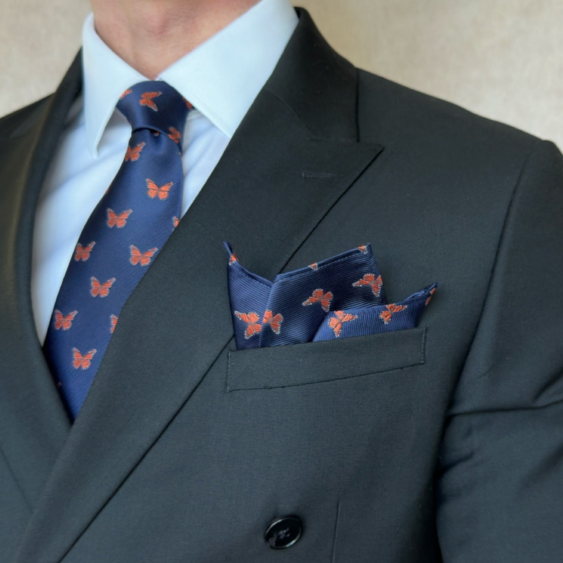 An expertly crafted blue pocket square with intricate butterfly embroidery. Made with precision and grace, add a touch of elegance to your attire with this stunning accessory.