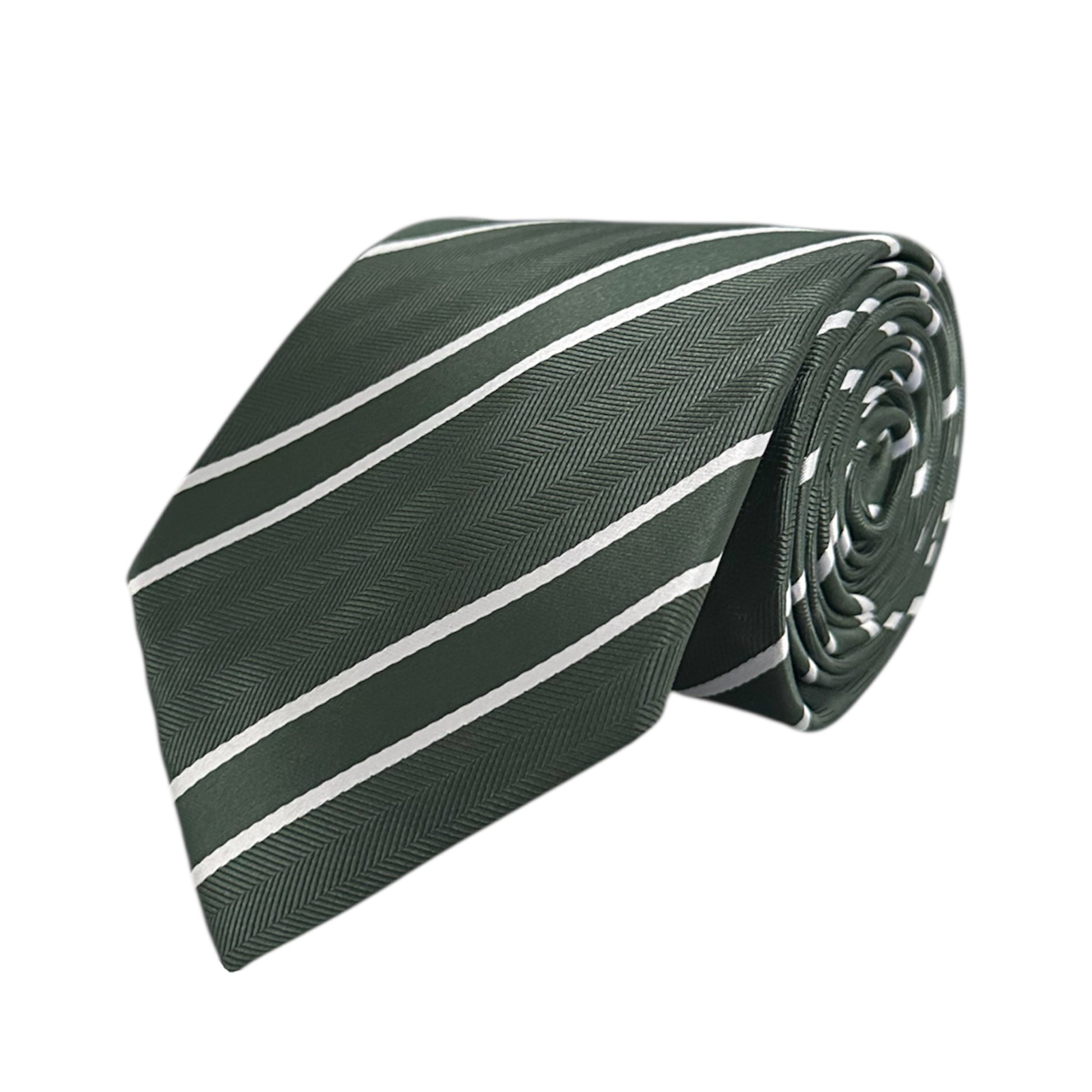 This forest green tie with crisp white double stripes combines bold color with a sharp, polished edge.