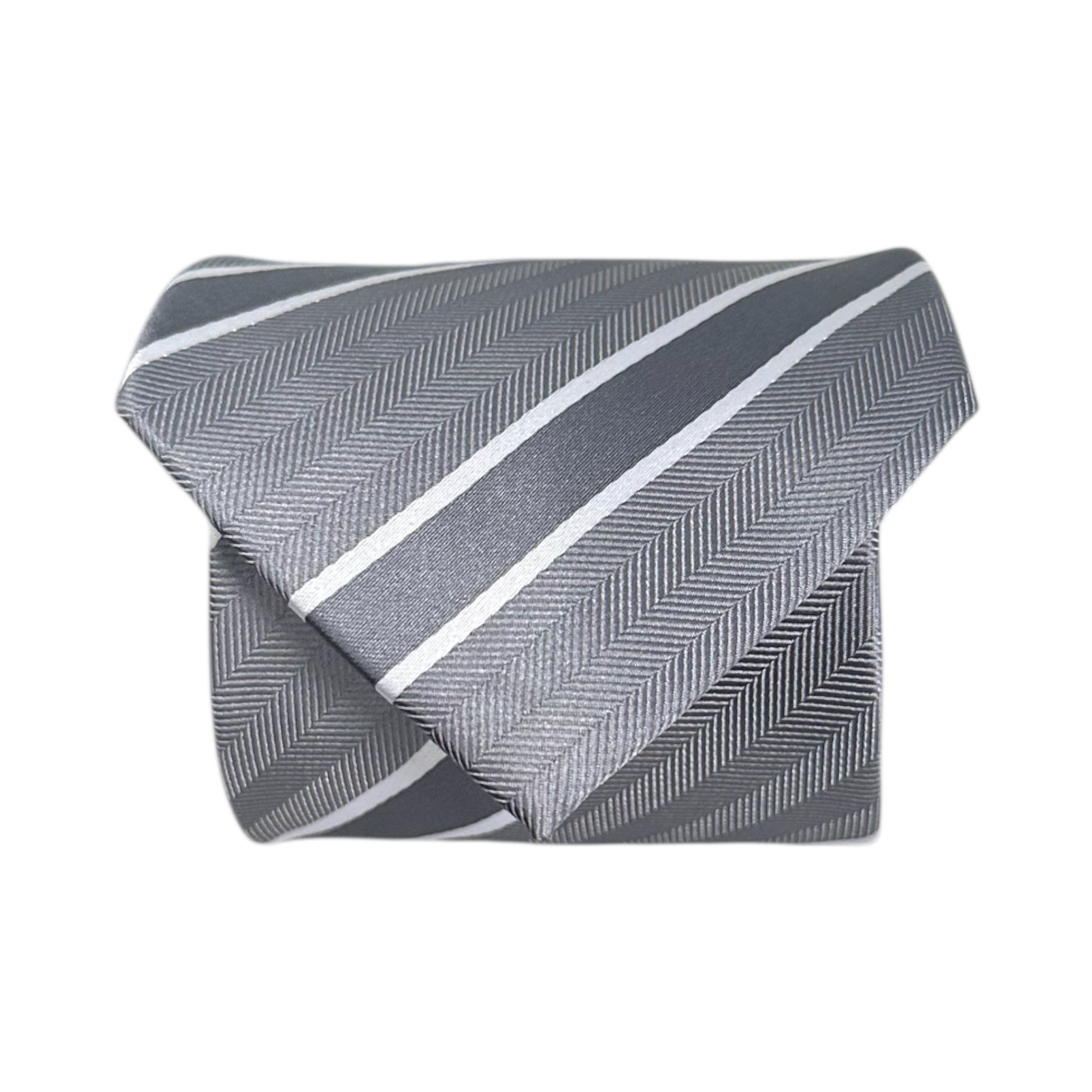 Sophisticated and sharp, this grey herringbone tie with double white stripes adds a polished touch to any outfit.