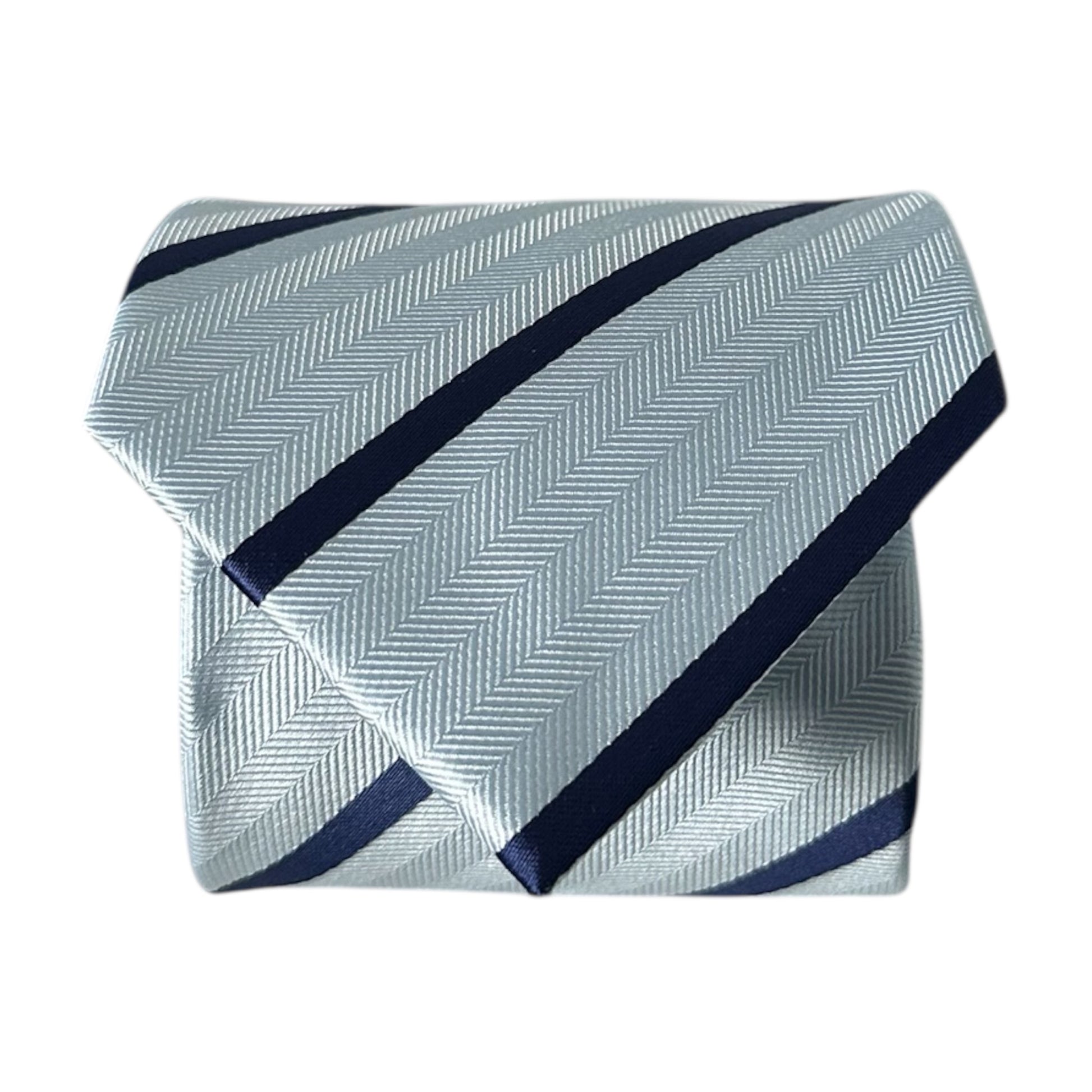 Experience effortless sophistication and timeless style with our Light Blue & Navy Blue Single Stripe Tie. Made with a beautiful herringbone pattern, this tie adds a touch of elegance to any outfit.