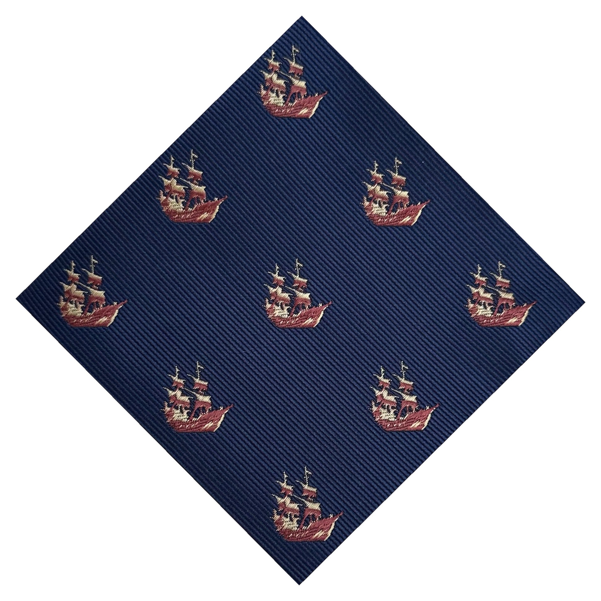 A distinguished blue pocket square adorned with gold sailing ship embroidery, embodying the thrill of the open sea and the daring spirit of nautical adventure.
